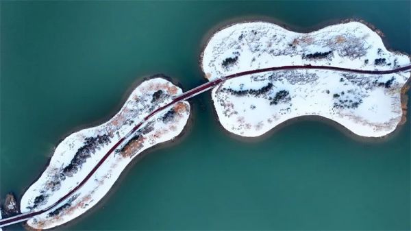 碧綠的湖水與潔白的雪景相互映襯