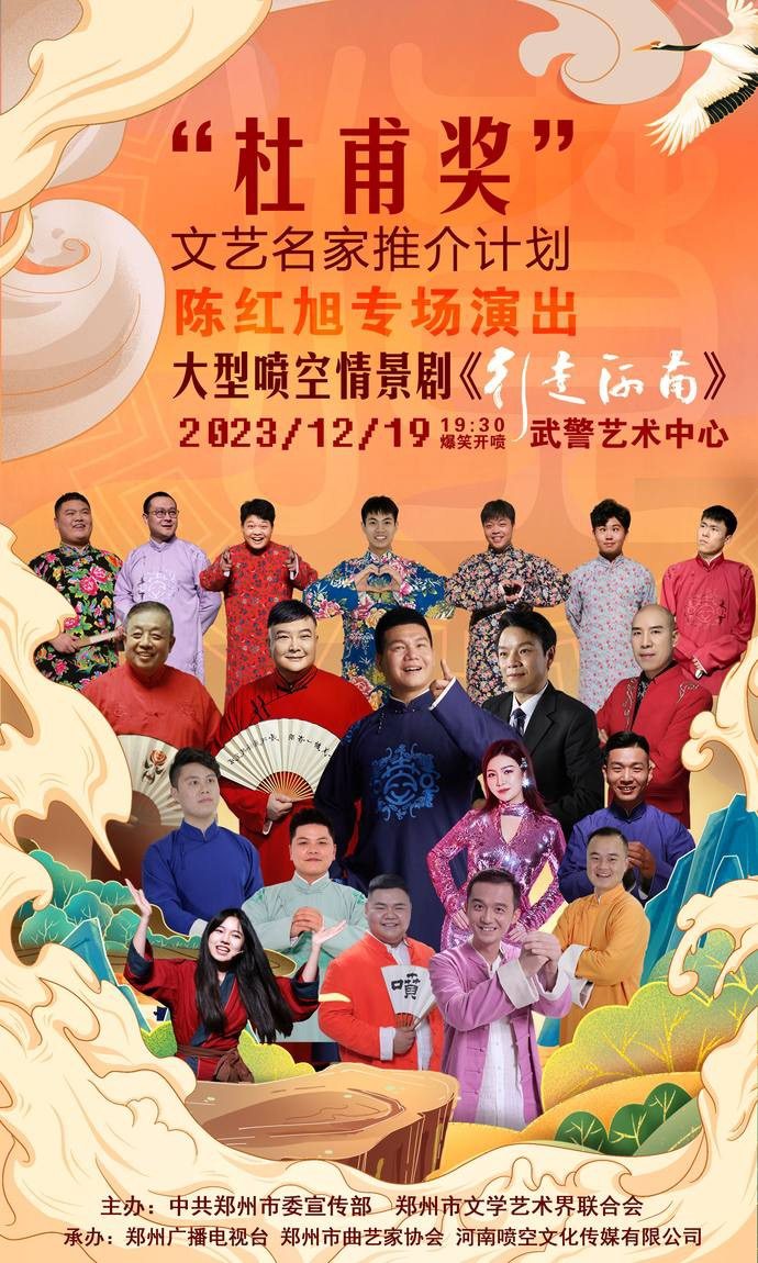 噴空與戲劇、歌曲、戲曲、響堂等藝術(shù)形式相融合,中國曲藝家協(xié)會副主席范軍、河南豫劇三團(tuán)團(tuán)長賈文龍、鄭州市曲藝家協(xié)會主席陳紅旭等明星大腕云集薈萃……12月19日,“杜甫獎”文藝名家推介計劃——陳紅旭專場大型噴空情景劇《行走河南》在武警藝術(shù)中心成功舉辦。