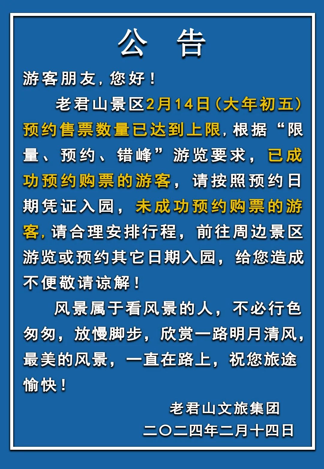 注意!老君山景區(qū)2月14日門票預(yù)約已滿!