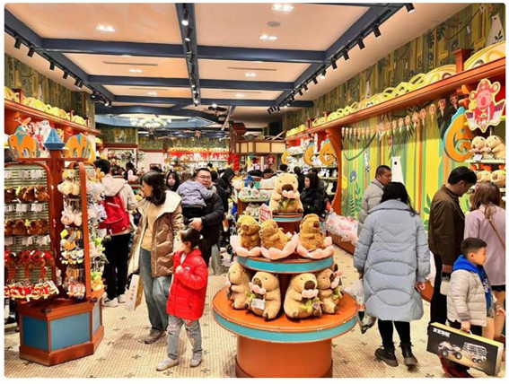 銀基動物王國內(nèi)最大的綜合文創(chuàng)店佳寶集市商店這個春節(jié)的生意格外火爆。根據(jù)銀基璨樂文化創(chuàng)意有限公司負責人介紹,春節(jié)假期,度假區(qū)內(nèi)文創(chuàng)周邊熱銷商品13.7萬件。“其中我們自有原創(chuàng)設計商品占到70%,節(jié)前我們與動物星球聯(lián)名開發(fā)了以夢幻動物園內(nèi)的白虎、獅子、棕熊和狼王為原型的盲盒手辦,一經(jīng)推出就特別受歡迎,我們自己設計開發(fā)的動物主題棒球帽、豆丁尾巴、趴趴動物徽章趴肩公仔、水豚周邊等與我們園區(qū)內(nèi)網(wǎng)紅動物相關(guān)的周邊商品售賣情況也都很好。”