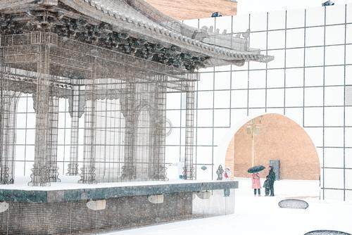大雪驟至,只有河南·戲劇幻城景區(qū)銀裝素裹,百畝麥田披上雪被,形成大片起伏的白色波浪,星星點點的翠綠麥苗點綴其間,展現(xiàn)出一幅生機盎然的唯美圖景。放眼望去,黃土澆筑的夯土墻與漫天飛舞的雪花相互映襯,留白韻味的冬景畫卷在幻城的格子空間鋪展開來,在此刻,厚重與輕盈、靈動與莊重達到了極具美感與夢幻的和諧融洽。