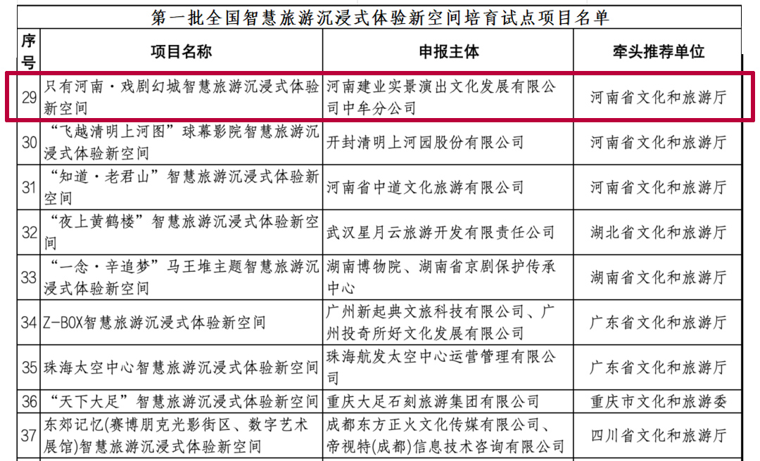 近日,文化和旅游部、國家發(fā)展改革委、工業(yè)和信息化部公布第一批全國智慧旅游沉浸式體驗新空間培育試點項目名單,全國共42個項目上榜,建業(yè)文旅旗下的只有河南·戲劇幻城智慧旅游沉浸式體驗新空間名列其中。