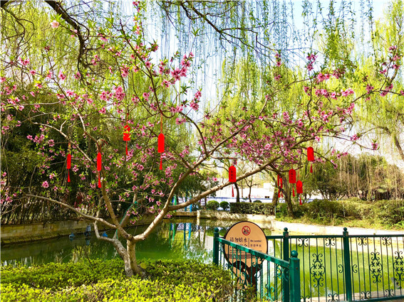 在鴛鴦湖廣場(chǎng)設(shè)置的桃花許愿樹也吸引不少游客,不少人在樹上掛出紅色的許愿符,許下美好的愿望。