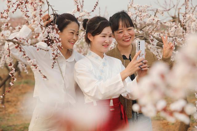 尉氏縣門(mén)樓任鄉(xiāng)沙沃村千畝果園里的杏花競(jìng)相綻放,游客穿行在杏花叢中拍照游玩,盡享春日美好時(shí)光( 3月16日攝)。 李新義 攝