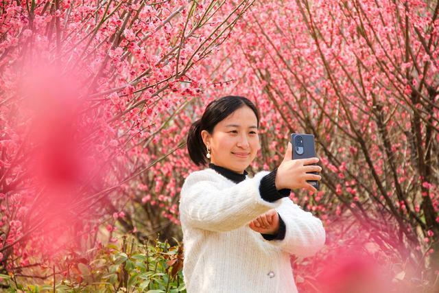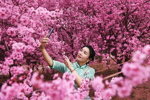3月23日,游客在焦作市龍?jiān)春珗@美人梅林旁賞花拍照。 劉金元 攝