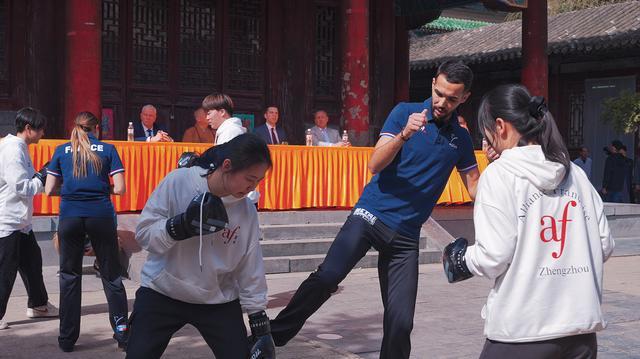 在老師的悉心指導下,學生們一招一式學得有模有樣。法國初二學生貝愛麗絲曾練過空手道,她動作學得快、做得準,得到中法老師的一致表揚。她用一口流利的漢語說:“我從小在北京長大,早就想來少林寺看一看。今天同時學到了少林功夫和法式拳擊,了解到不同文化的知識,收獲很大。”