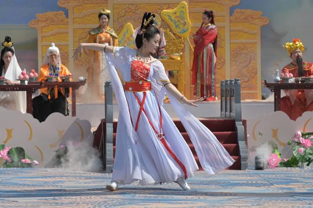 宴會以太白金星誦開場詞拉開序幕,各位神仙依次向西王母獻禮賀壽。活動過程中不僅有七仙女的舞蹈、執(zhí)陽圣君金烏敲擊揚琴等傳統(tǒng)歌舞表演,還有哪吒搗亂、財神與月老斗嘴等搞笑名場面,更有投壺、飛花令等有趣的互動環(huán)節(jié),使游客沉浸式參與到演出的過程中,用一種新的方式讓人們了解包括《山海經(jīng)》在內(nèi)的中國古代神話故事。