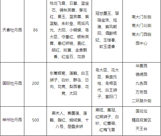 全園共有200多個(gè)品種牡丹開放,開花牡丹約占本園牡丹的55%,主要分布在華夏園、錦繡園、九色園、萬芳園和二環(huán)路外側(cè)等處。其中:盛開的牡丹品種有東籬銀菊、蓮鶴、白王獅子、白妙、群烏、日向、花競、梨園春、花競、太陽等;初開的牡丹品種有島大臣、花大臣、紫盤托桂、島根圣代、白王獅子、宣陽門等。園內(nèi)冰心、熱戀(紅色荷包牡丹)、玫瑰忍冬、碧桃、櫻花等競相綻放。