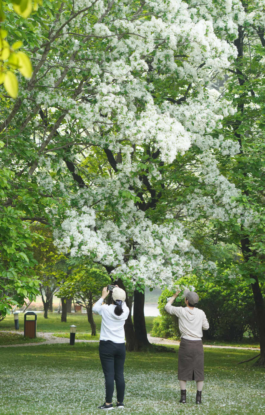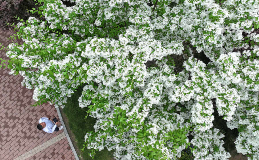 2024年4月16日,鄭州經(jīng)緯廣場的流蘇樹正值花期,白色花朵鋪滿枝頭如云似雪,雅稱“四月雪”。