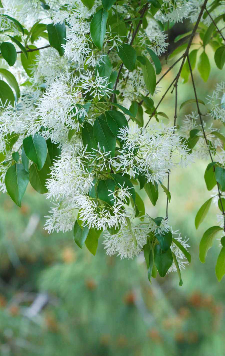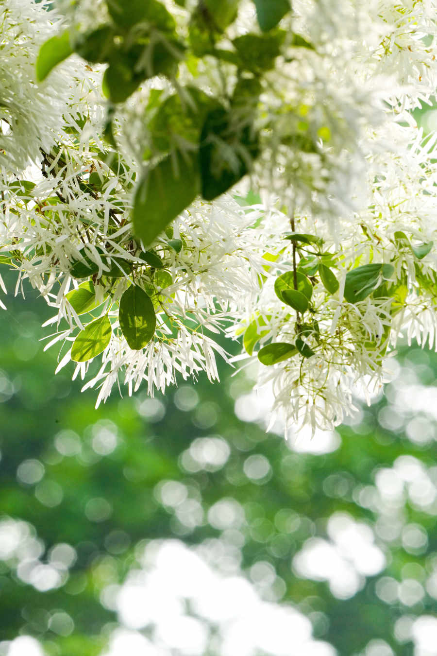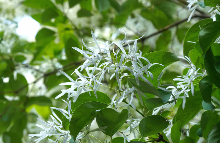 流蘇花花冠純白,形狀如絲,如同倒掛的小傘,因為長得像古代仕女服飾中的流蘇而得名。古詩中這樣描寫:“四月春色雪紛紛,萬里北國又鋪銀”、“流蘇雪浪煙花樹,皚皚疑作臘九冬”、“流蘇花放四月天,雪浪翻飛動云煙”。