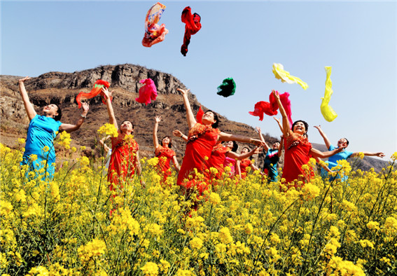 在趙莊村,山間梯田、石拱橋、古民居等景觀與片片油菜花海交相輝映,美不勝收。游人紛紛覓香而來,在油菜花田中體驗一把“飛入菜花無處尋”的詩情畫意。此外,游客在賞花之余,還到村里探尋文化故事,體驗網(wǎng)紅娛樂項目,收獲別樣趣味。