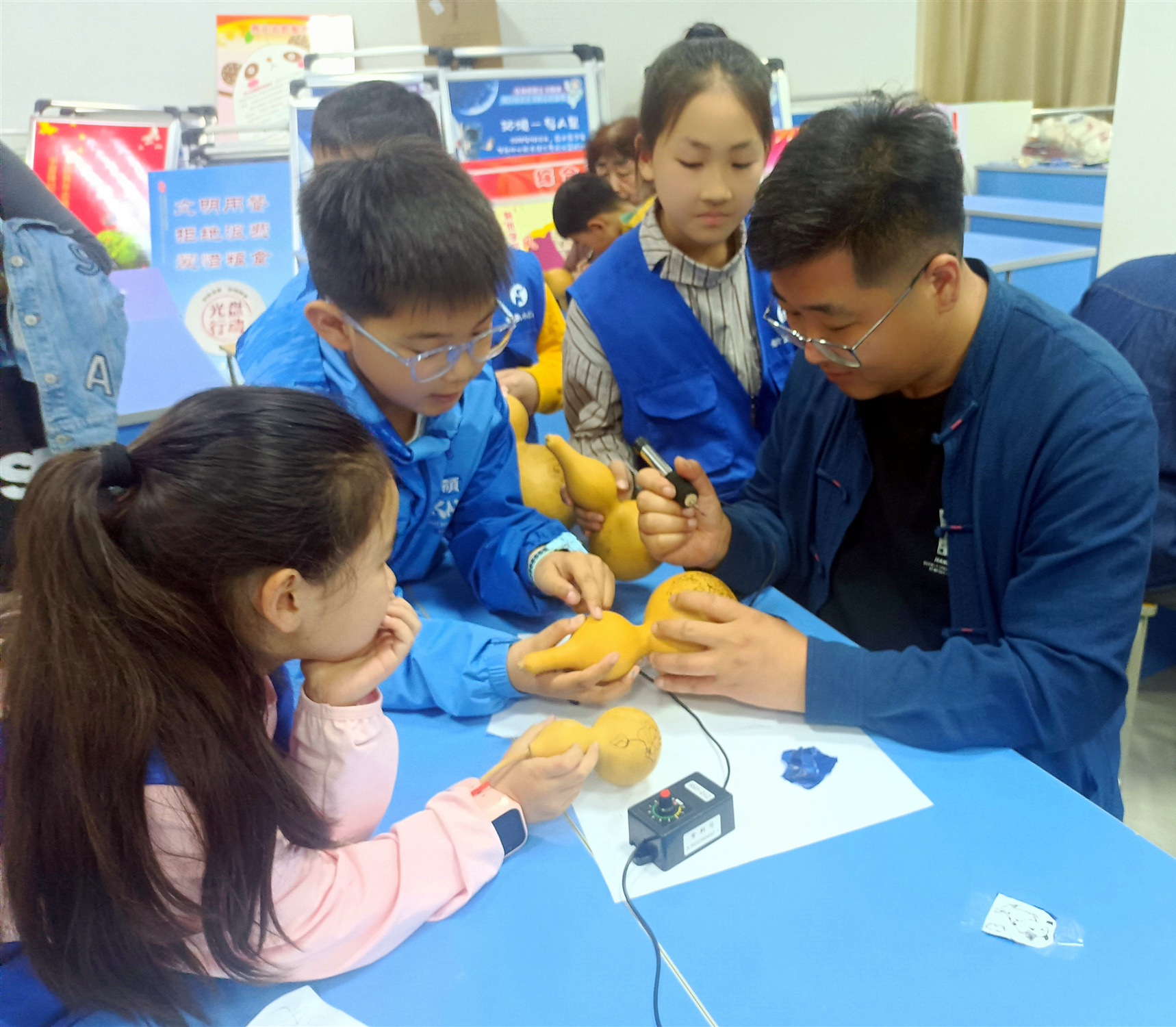 陳浩云(右一)給孩子們講解烙畫的制作流程 琚銘潔 攝
