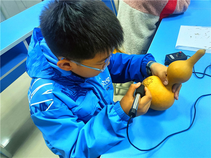 當(dāng)孩子們看到陳浩云曾獲獎(jiǎng)的絲絹烙畫作品時(shí),被其惟妙惟肖、栩栩如生的人物細(xì)節(jié)驚艷到,紛紛拿起工具親手制作起來。通過陳浩云生動(dòng)的講解,烙畫在孩子們稚嫩的生活經(jīng)歷中烙下了深深的一筆。“很多孩子第一次接觸烙畫就很感興趣,希望以后能有更多人接觸烙畫、了解烙畫,這樣才能將非遺文化更好地傳承下去。”陳浩云說。