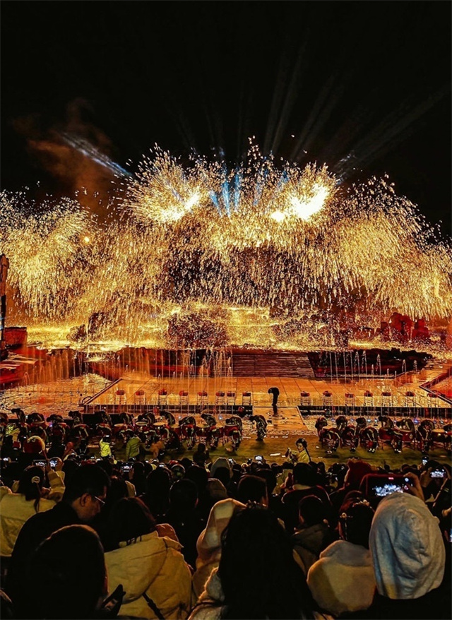 鐵樹銀花落,萬點(diǎn)星辰開。傍晚時(shí)分,司徒小鎮(zhèn)“千年鐵魂”實(shí)景演出現(xiàn)場人山人海,來自全國近千名網(wǎng)絡(luò)達(dá)人、百余家媒體與4000多萬粉絲達(dá)人白冰一起,共同見證新的打鐵花吉尼斯紀(jì)錄™稱號(hào)。隨著吉尼斯紀(jì)錄認(rèn)證官宣布活動(dòng)正式開始,眾人期盼的打鐵花震撼上演,只見1600攝氏度的鐵汁在高空中被擊打成鐵花,鐵花猶如雨點(diǎn)落下。“我今天還是第一次在現(xiàn)場看‘打鐵花’。” 來自鄭州的游客劉新說,“我只能用‘震撼’來形容今晚的場面,只能用‘激動(dòng)’來形容我現(xiàn)在的心情。