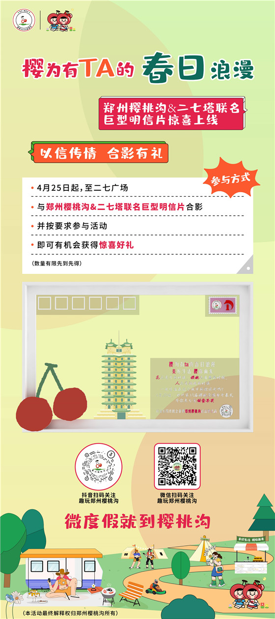 記者今日從二七區(qū)櫻桃溝管委會獲悉,4月25日10點起,由鄭州櫻桃溝舉辦的“以信傳情,合影有禮”活動正式啟動,市民游客可前往二七廣場中心的二七紀念塔下,拍攝家人、朋友等和鄭州櫻桃溝&二七塔聯(lián)名打造的“明信片”合影,并參加現(xiàn)場指定互動方式,即可有機會領(lǐng)取鄭州櫻桃溝周邊文創(chuàng)、櫻桃溝各景點門票(長安古寨、瞻園、特蘭斯童話世界+小龍蝦一斤(堂食)、正賽卡丁車)以及萬象城、無限城、亞細亞送出的紀念品等。