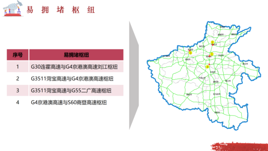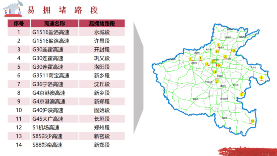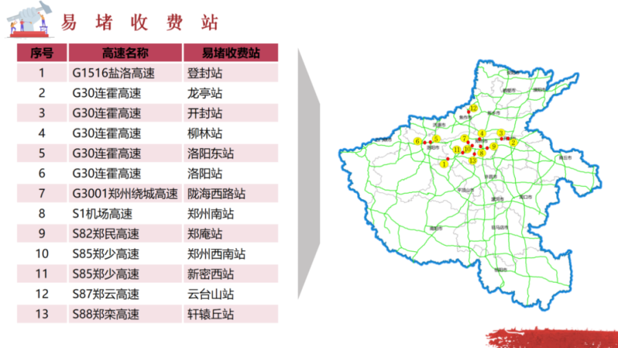 3.高峰路段:國(guó)家主干線、重點(diǎn)景區(qū)及鄭州周邊附近高速路段通行壓力較大,相關(guān)毗鄰收費(fèi)站上下站通行的車(chē)輛相對(duì)集中。