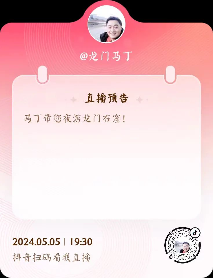 龍門石窟金牌講解員馬丁將在今晚(5月5日)19:30,在抖音平臺直播,帶您夜游龍門,讓大家在返程的路上也能再賞龍門石窟的瑰麗夜景!大家可以掃描海報上的二維碼或者抖音搜索“龍門馬丁”即可和我們一起“云游”龍門!