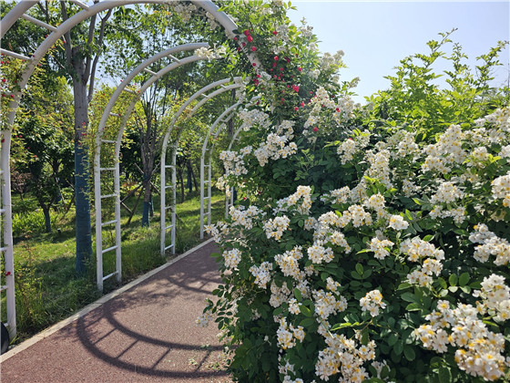 白薔薇、紅木香串起百米花廊,鐵藝拱門營(yíng)造小清新氛圍感,從這里走過,每個(gè)瞬間都值得定格。