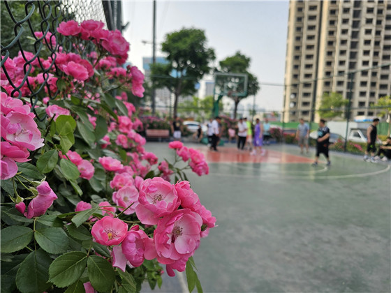 在位于九都路與桂園路交叉口南的桂園路社區(qū)體育公園,三人制籃球場(chǎng)圍網(wǎng)處被藤本月季點(diǎn)綴得分外亮眼,為運(yùn)動(dòng)增添新活力。