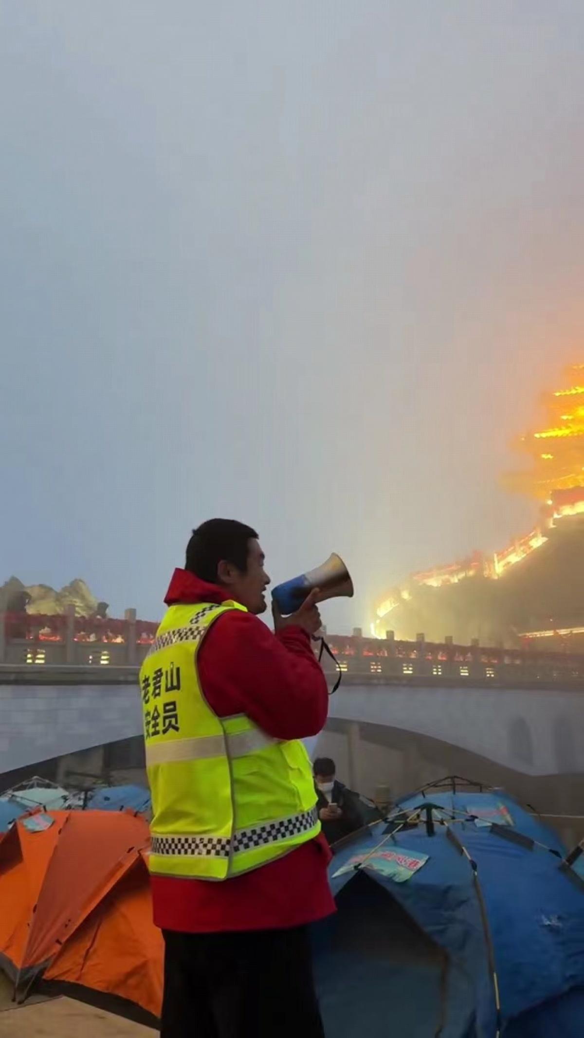 直至5月5日凌晨,守護(hù)在寒夜里的老君山工作人員,開始用幽默的“叫醒服務(wù)”喊道“各位小公主、小王子,趕快起床看日出了”。