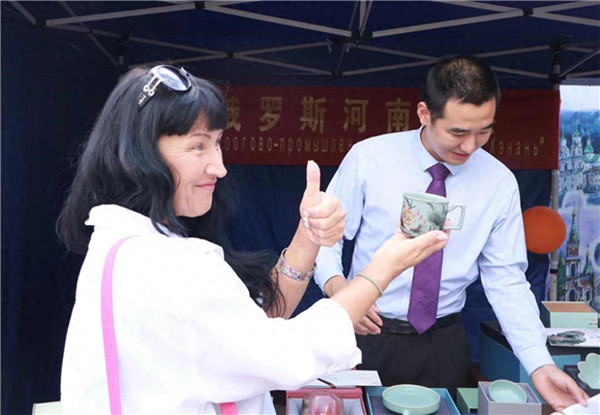 展會期間,格羅德諾州副州長到汝瓷展區(qū)參觀,河南商會工作人員熱情介紹了平頂山市寶豐汝瓷的制作工藝和藝術(shù)特色,推薦了河南平頂山寶豐清涼寺、汝官窯遺址展示館、汝窯博物館和來自這片土地的汝瓷作品。