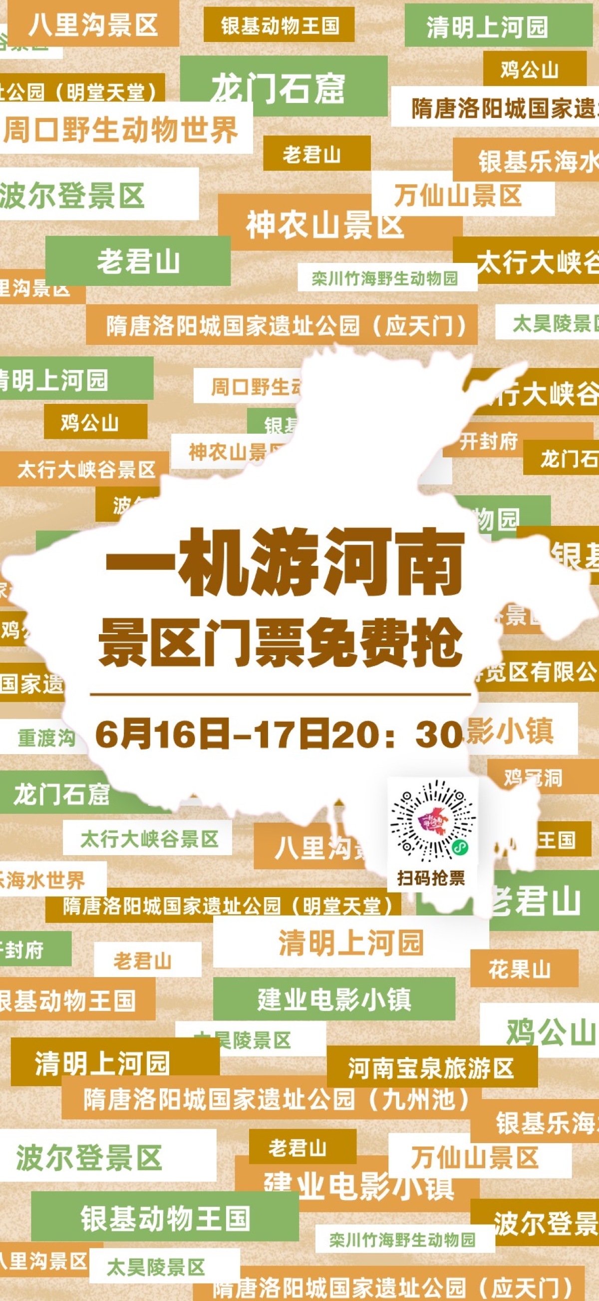在全省旅游發(fā)展大會期間,“一機游河南”平臺聯動全省25家明星景區(qū)舉行景區(qū)免票活動(參與景區(qū)名單詳見附件)。6月16日-17日每天20:30,游客可通過微信搜索“一機游河南”小程序,參與活動,2500張門票助力游客暑期暢游河南。