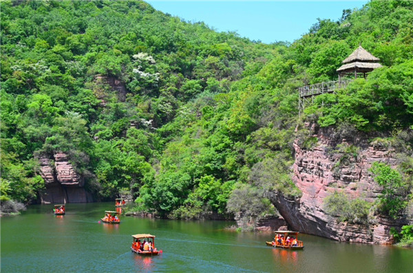 百余米高的赤壁丹崖紅巖疊嶂,與生動鮮活的綠色植被交相輝映,溪水潺潺,鳥鳴啾啾,蟬鳴陣陣,愜意似仙境。