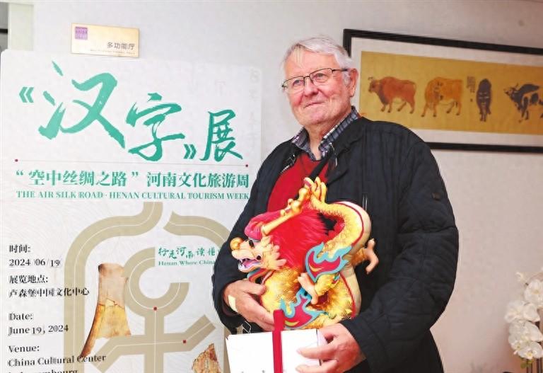 盧森堡老人布拉切克在“漢字”主題展前合影留念。記者 杜小偉 攝