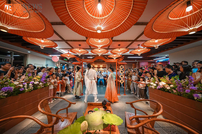 精彩表演之外,“唐宋夢華”主題街區(qū)還有非遺市集,剪紙、捏面人、漆扇、傳統(tǒng)花燈、豆花染布等近百種傳統(tǒng)非遺老字號齊聚一堂;非遺傳統(tǒng)魚燈巡游,伴隨著曲樂鼓點,把中秋的祝福送給現(xiàn)場游客;熱鬧的唐宋雅集里,挑貨郎、賣花女走街串巷,與游客親切互動,讓市民在“逛逛逛”中感受唐宋市井的繁華與喧囂。