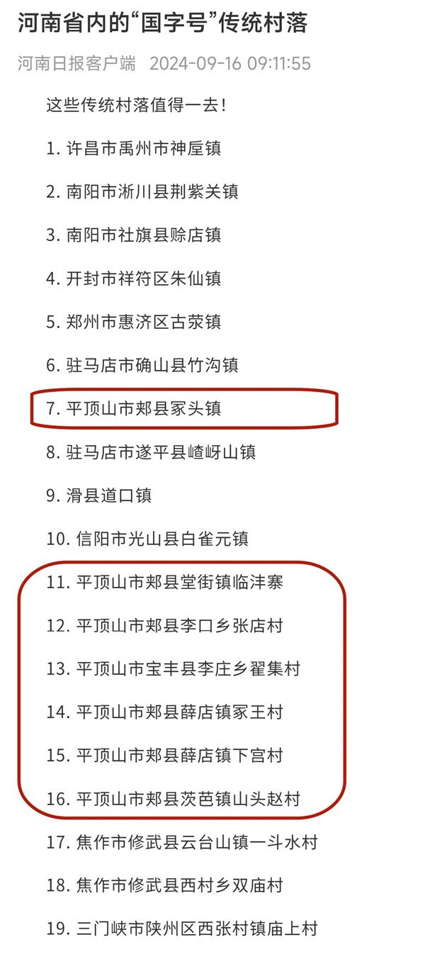 此外,河南日報(bào)客戶端以“這些傳統(tǒng)村落值得一去河南省內(nèi)的“國字號”傳統(tǒng)村落”為題,推薦了19個(gè)“國字號”傳統(tǒng)村落,其中平頂山就有7個(gè)。