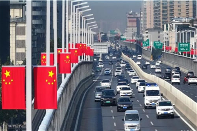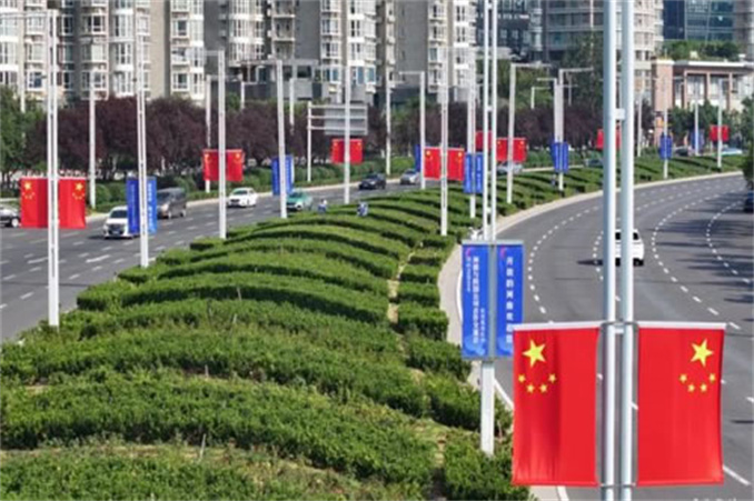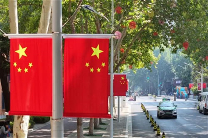 在藍天白云的襯托下,五星紅旗迎風飄揚,把街頭巷尾裝扮得明艷靚麗,將節(jié)日氛圍渲染得格外濃烈,滿城涌動著深深愛國情。