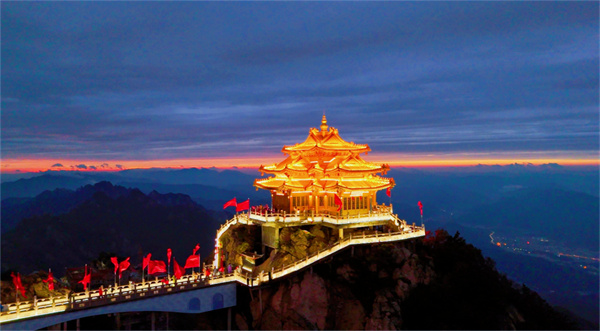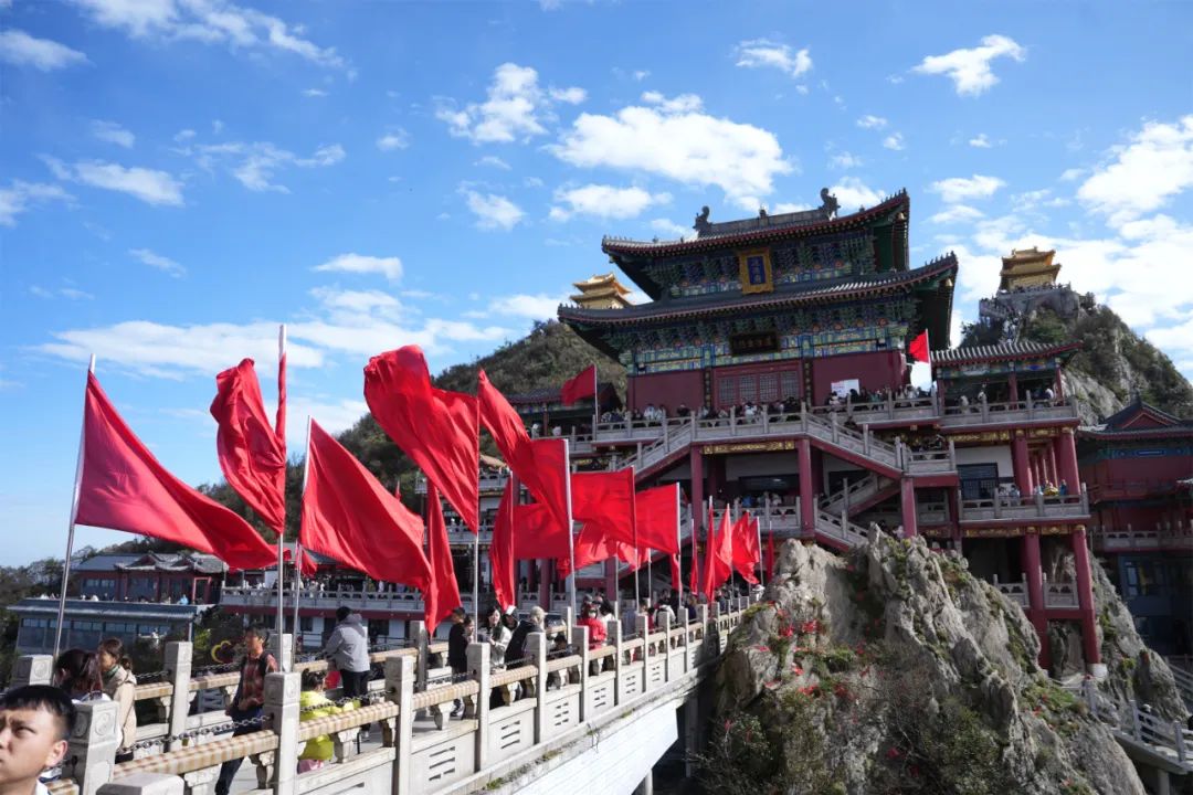 此時的老君山景色,可以用“如畫”二字來形容。國慶假期,鮮艷的紅旗、蒼翠的松柏、碧藍(lán)的天空相映成趣。