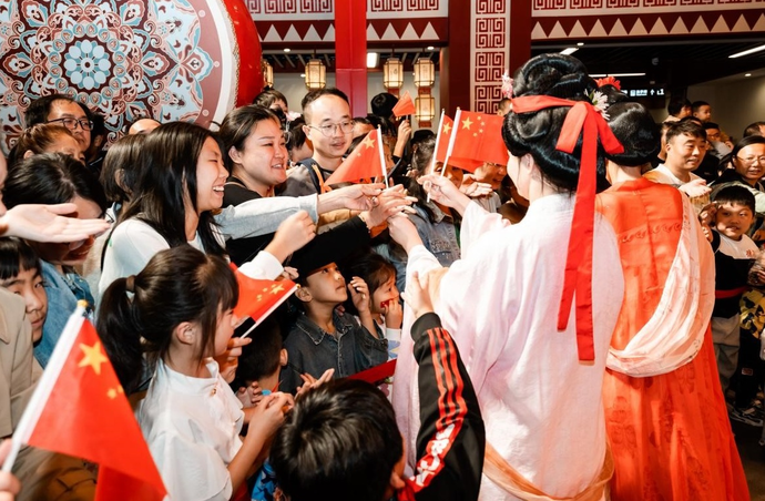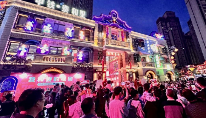 假期期間,中鐵·泰和里主題街區(qū)內(nèi)游人如織,數(shù)千面五星紅旗隨風(fēng)飄揚(yáng),一片欣欣向榮、國(guó)泰民安的盛世景象。街區(qū)以不同時(shí)期的特色建筑、不同時(shí)代的空間場(chǎng)景和沉浸式演藝大劇,呈現(xiàn)穿越時(shí)空的互動(dòng)情景,使市民和游客現(xiàn)場(chǎng)感受歷史與現(xiàn)代的交融,體驗(yàn)不同時(shí)代的繁華市井生活。