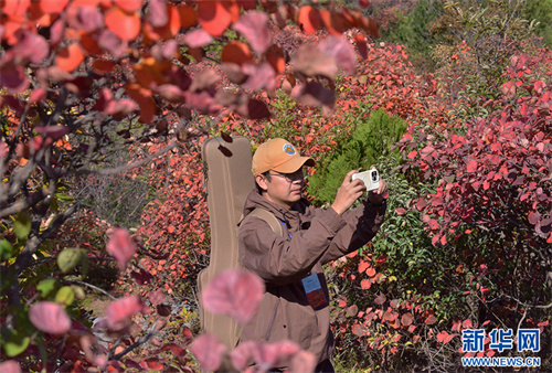 10月15日,在焦作市博愛(ài)縣青天河風(fēng)景名勝區(qū),游客在拍照。