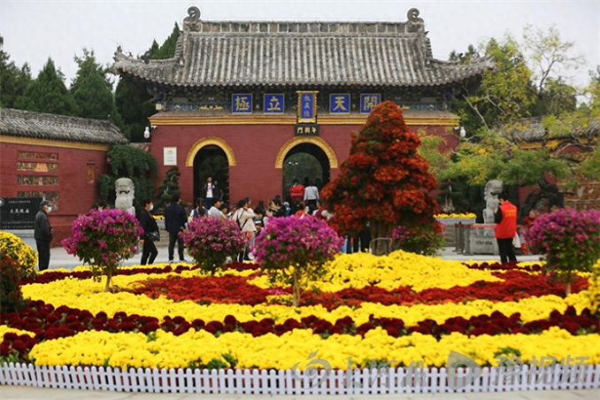 10月17日上午,記者步入周口淮陽(yáng)太昊陵景區(qū)看到,午朝門(mén)外精心布置有巨大的菊花造型,盛開(kāi)的菊花爭(zhēng)奇斗艷,吸引著游客打卡拍照。從午朝門(mén)走進(jìn)太昊陵,中軸線兩旁鋪滿(mǎn)了菊花,其中還有“孔雀開(kāi)屏”、“雙龍戲珠”等不同寓意的造型,讓游客們大飽眼福。