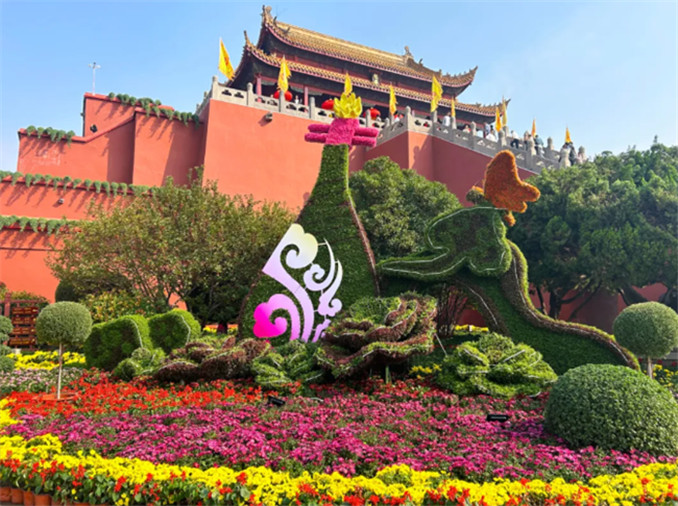 為迎接菊花文化節(jié),城墻景區(qū)共布置了11處景點(diǎn),共計(jì)菊花5000余盆。運(yùn)用菊花精心布局再現(xiàn)《千里江山圖》的意境與氣魄,勾勒出了一幅生動(dòng)鮮活的秋日勝景。