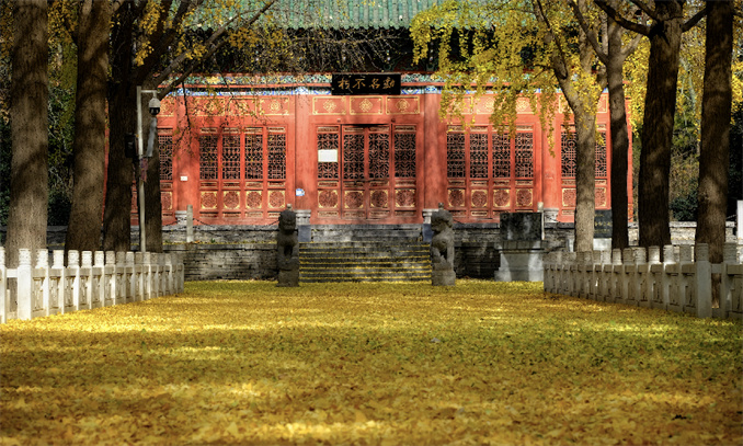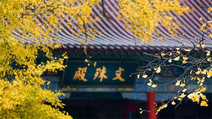 文殊寺院中5棵2580多年樹齡的銀杏像一張張巨大的手掌覆蓋寺廟,伴隨滿地黃葉,靜坐品茗,仿佛可以把世間一切煩惱忘卻。