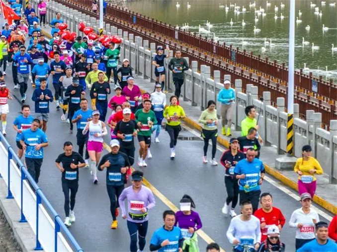 賽道穿越三門峽天鵝湖國家城市濕地公園,參賽者們仿佛置身于一幅人與自然和諧共生的美麗畫卷。正值白天鵝來三門峽越冬之際,馬拉松與“天鵝季”不期而遇,為比賽增添了一份別樣的韻味。