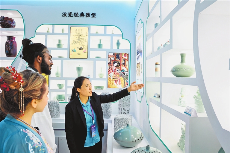 第十一屆中原文化產(chǎn)業(yè)博覽交易會現(xiàn)場,講解員向身著漢服的國際友人介紹汝瓷作品。 王涵 攝