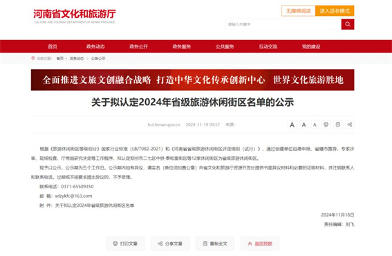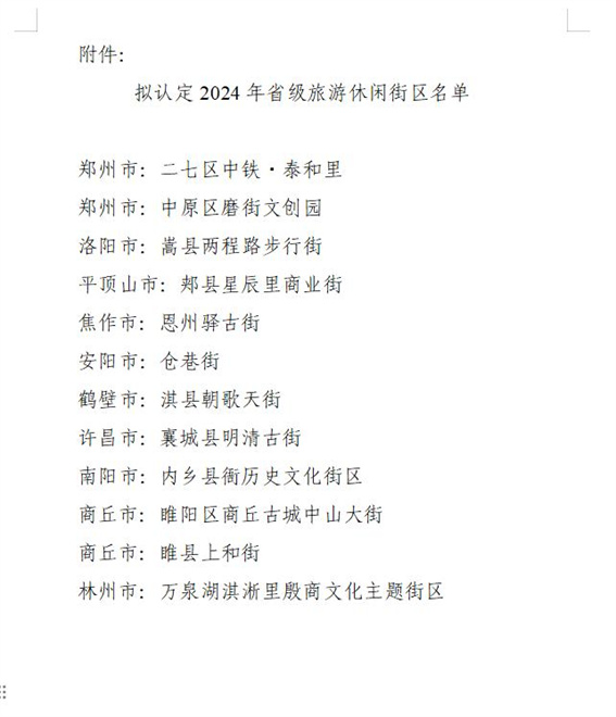 近日,河南省文化和旅游廳發(fā)布公示,根據(jù)《旅游休閑街區(qū)等級(jí)劃分》國(guó)家行業(yè)標(biāo)準(zhǔn)(LB/T082-2021)和《河南省省級(jí)旅游休閑街區(qū)評(píng)定細(xì)則(試行)》,通過(guò)創(chuàng)建單位自愿申報(bào)、省轄市推薦、專(zhuān)家評(píng)審、現(xiàn)場(chǎng)檢查、廳黨組研究決定等工作程序,擬認(rèn)定嵩縣兩程路步行街等12家休閑街區(qū)為省級(jí)旅游休閑街區(qū)。