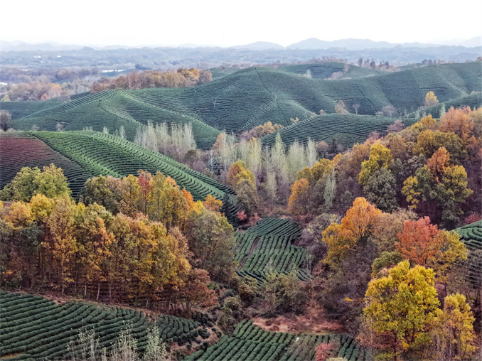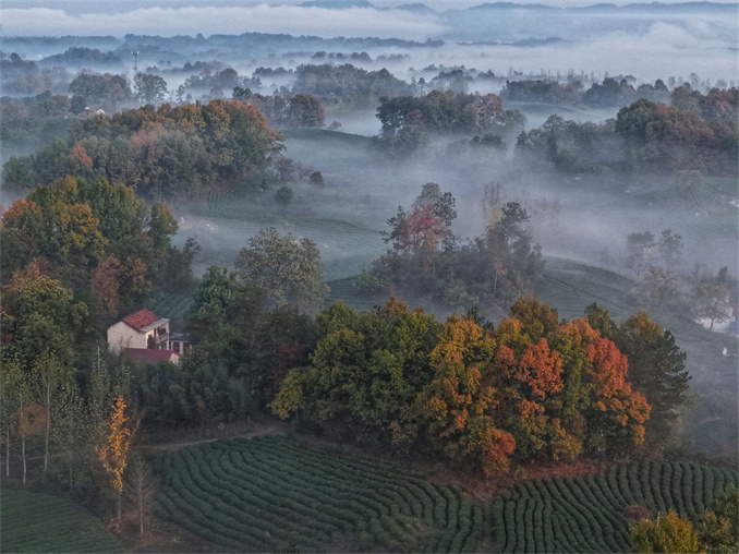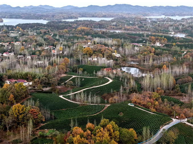 茶園里,茶樹在寒風(fēng)中換上了斑斕的衣裳,綠葉間夾雜著金黃、深紅,宛如大自然最隨性的調(diào)色盤。連綿起伏的茶山,在朦朧的云霧中若隱若現(xiàn),與遠(yuǎn)處碧波蕩漾的南灣湖水遙相呼應(yīng),美得不似人間。