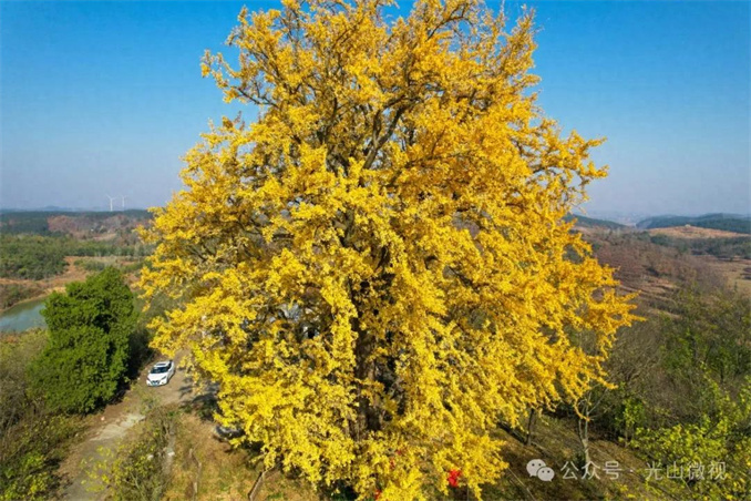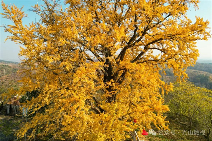 據(jù)史料記載,南向店鄉(xiāng)五岳村大山寨這棵古銀杏樹(shù),距今已有1000多年的歷史,樹(shù)高30多米,徑圍4米多,干高冠大,威武挺拔,光山縣人民政府及林業(yè)部門(mén)已通過(guò)建檔、掛牌等措施對(duì)該樹(shù)進(jìn)行保護(hù)。由于這里地處五岳水庫(kù)旁的丘陵地帶,氣溫偏低,土壤肥沃而濕潤(rùn),相比常規(guī)銀杏樹(shù),這棵古銀杏黃的較晚,目前進(jìn)入最佳觀賞期。