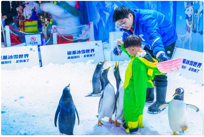 打造冰雪文旅新場景、新業(yè)態(tài),鄭州銀基國際旅游度假區(qū)著力探索冰雪新玩法——到翡翠谷看唯美冰雕、與小企鵝們親密互動,跟著雪怪去冒險,以IP形象雪貓?zhí)乜撕托∨q達故事為主線,融合冰上表演和特技的精彩演出令游客目不暇接。