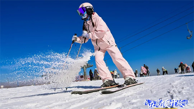 走進(jìn)嵩頂滑雪度假區(qū)記者看到,雪道入口處,專業(yè)教練正在給初學(xué)者傳授滑雪技巧;雪道上,滑雪愛(ài)好者踏上雪板,馳騁而下,暢享冬日里的速度與激情。
