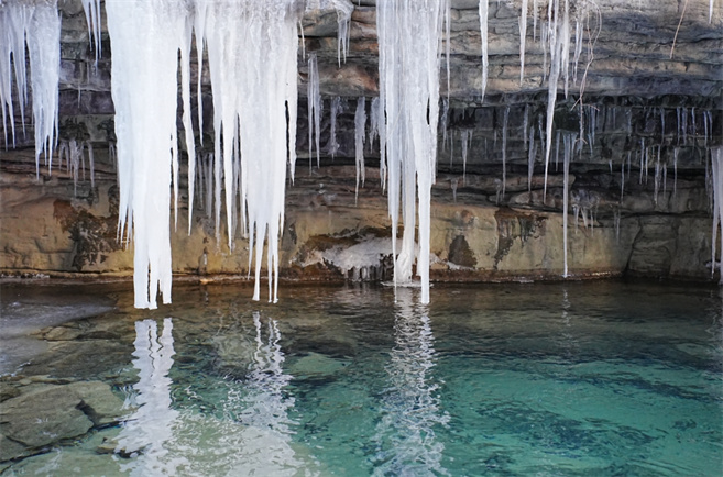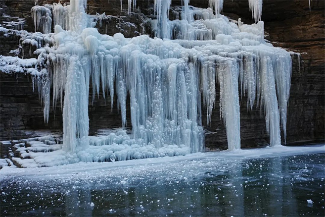 夏日里溪水叮咚,潭水清澈見底。冬季碧水依舊在,巖崖上方增添了不規(guī)則的冰雪圖案相伴。