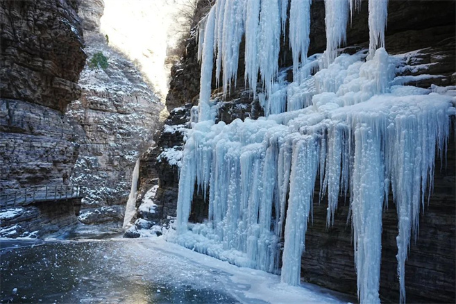 進入12月中下旬,太行大峽谷的溪流、飛瀑、草叢等景觀或凝固成冰,或被冰雪所覆蓋,幻化成白色的“童話仙境”,引人入勝!