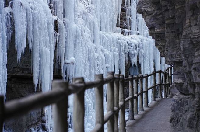 在太行大峽谷幽靜的世界里,冰河,冰掛隨處可見,冰川、冰柱、冰凌,或鑲嵌在高崖之上,或懸掛于峽谷兩側(cè),展現(xiàn)出冬季里壯觀的秀美,仿佛進入了一個冰清玉潔的童話世界。