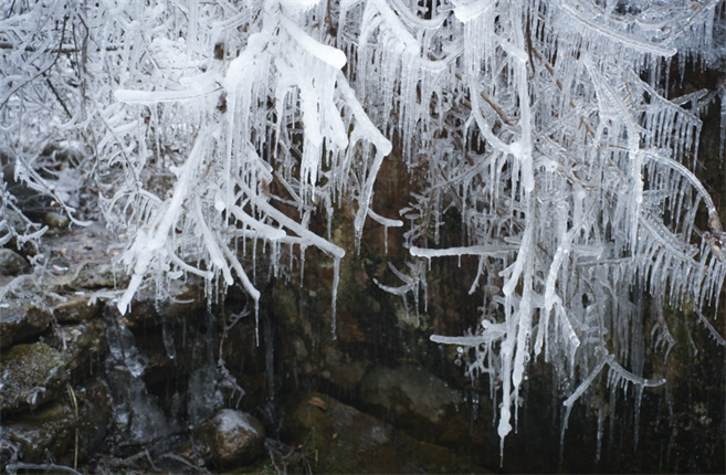 潔白晶瑩的冰掛與飛珠濺玉的瀑布相映成趣,一動一靜,一水一冰,如同走進一座座精雕細琢的水晶宮。今日流動的水,也許是明日晶瑩的冰,潺潺的河溪凝結(jié)成潔白的“玉帶”在山間舞動,更有壯麗的巨型冰瀑高懸在崖壁之上,將一處處懸崖峭壁裝扮成了富麗堂皇的水晶宮。