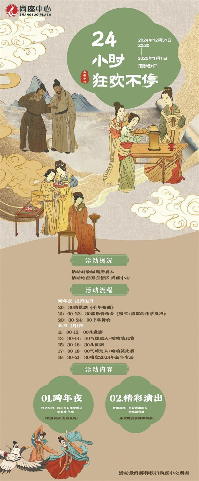 和“李白”“杜甫”“白居易”“上官婉兒”“蘇妲己”“老子”“莊子”等古人一起跨年是一種什么體驗?歷史名人從四面八方相聚,相互問候、吟詩作對,再來欣賞一場大型沉浸式歌舞劇《穿越千年來跨年》,新年的第一天更能迎來噴空2025年新年專場。以文化為主線,用快樂連線,穿越千年來跨年。