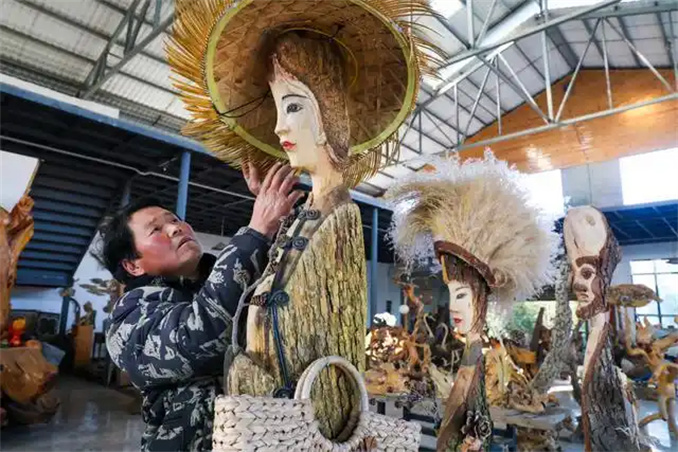 “一個人致富不算富,能帶動大家一起富才是真的富。這里的作品材料都是從山林里撿來的枯枝爛藤。這兩年在我的帶動下,村里很多人都開始了創(chuàng)作。也有不少人在勞動之余從山里撿來奇形怪狀的石頭、樹樁送到我這里賣錢,每年收入都不少。”駱彥紅說。